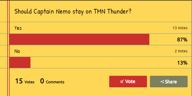 On the most previous episode of TMN Thunder, Captain Nemo faced Captain Ginyu in a Thunder tryout match! In a match that was rated 4.5 by Mr. Brazill [and you can click here to watch that match], Captain Nemo was able to score a victory, unless the previous tryout, Eddy. Also unlike Eddy, Captain Nemo won the Viewer Voting by a VERY WIDE margin, and you can click here to view the voting results. Captain Nemo had a 13-YES to 2-NO votes, and has earned himself a spot on the TMN Roster. He will begin his TMN career on Thunder and hopes to be successful enough to move on to the Main Show.