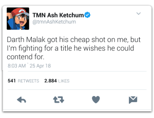 After his victory against Kylo Ren, Ash Ketchum punched his ticket in to the TMN Green Title Elimination Chamber match. At the same time, Ash Ketchum was attacked by current Atom-Weight Champion, Darth Malak. Malak and Ash’s feud started when Ash lost to Jack Sparrow during the first round of the March M4GNess Tournament, and Darth Malak took exception to Ash’s call out of Jack Sparrow. Both Sparrow and Darth Malak exist in the same stable: Civil War.